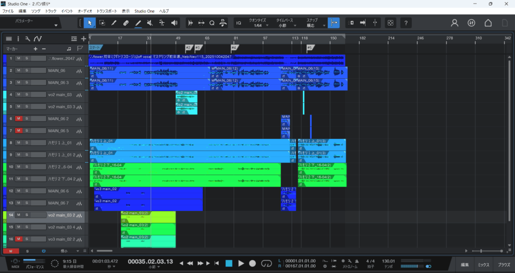 ですがそのままだとハモリパートもメインパートと同じ音量になってしまいごちゃごちゃした音声になってしまうのでハモリパートはメインパートより小さくするといった各パートの音量を全てのパートを流しながら調整していきます!