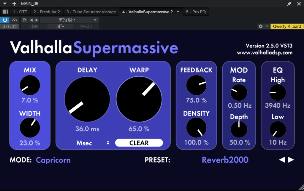 基本的にはプリセットのReverb2000を使っていますが、そのままだと音が響きすぎてまたモヤモヤしてしまうのでMIX(かかり具合)とWIDTH(広がり)、DELAY(音の遅れ)の掛かり具合を小さめにすることで音がまっすぐ耳に届きつつ、響くようにしています。