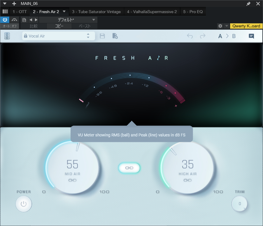 今回はプリセットの一つであるVocal Airを使用しましたが、このプラグインをかけすぎてしまうと耳がキンキンする音になってしまうのでかけすぎ注意!